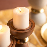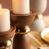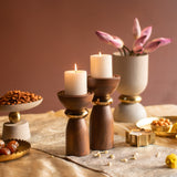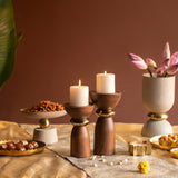 Elevate your décor with the Zuma Candle Holder Set of 2, crafted in rich brown wood with lustrous gold accents. The tall, sculptural bases are beautifully contrasted by wide tops, fitted to hold pillar candles. Thoughtfully designed for festive lighting or contemporary styling, this duo adds warmth and grandeur to any setting. Style them together for visual drama or individually as timeless accents across your home. Perfect for gifting, celebrations, or creating a signature corner of calm.