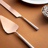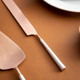Tapered lines and mixed materials make this hostess set a contemporary classic for dining and entertaining. Each piece is handcrafted from exceptionally durable stainless steel, then electroplated in lustrous copper and finished with white enamel handles. An elegant addition to the table, the set makes a stylish gift.