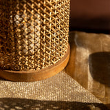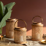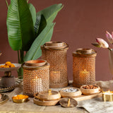 Bring earthy elegance and warm ambience into your space with this handcrafted rattan hurricane lantern. Featuring a natural woven cane body and a sturdy metal frame, this lantern blends organic texture with refined structure. Whether placed on a console, balcony, or as part of your festive décor, its soft candlelight glow adds a touch of serenity and charm. Use it as a solo accent or pair it with other pieces for a layered look. Perfect for indoor-outdoor settings, gifting, or intimate evenings at home.
