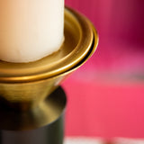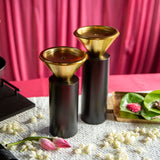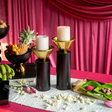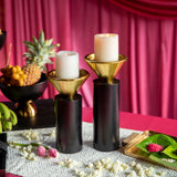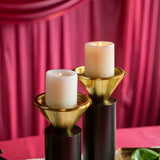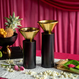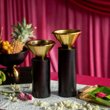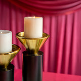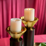 Introducing the Ziya Candle Holder Set, a perfect blend of contemporary sophistication and classic elegance. Each piece in this set features a sleek black base that provides a striking contrast to the radiant gold conical top. The geometric design not only enhances the visual appeal but also creates a dynamic interplay of light and shadow.