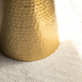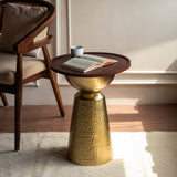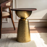 Elevate your space with this luxurious and artistic side table, featuring a stunning combination of materials and textures. The table showcases a rich wooden top, beautifully contrasted by a sculptural, hand-hammered gold metal base that adds both shimmer and sophistication. With its elegant hourglass-inspired form and refined finish, the Bran Side Table blends traditional craftsmanship with contemporary flair, making it a standout accent in living rooms, lounges, or bedrooms. Ideal for displaying décor, serving drinks, or simply enhancing your interior with a touch of glam.