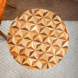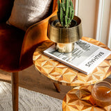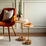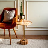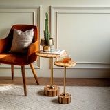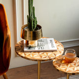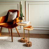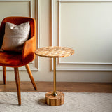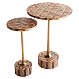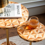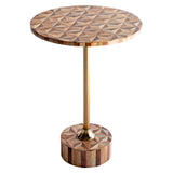 A perfect landing spot for a drink or a book, the Marquetry Accent Table elevates the sophisticated feel of a wooden look with modern accents of gold plated metal. Add a contemporary flair to your modern luxe living room with this stylish mixed material accent table. Featuring elaborate marquetry work using a variety of warm, natural wood species in a cubist art form, this end table is a sophisticated perch for homemade cocktails and tasty mixed drinks.