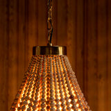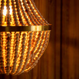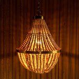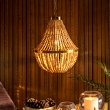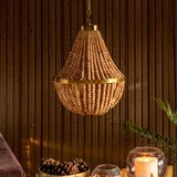 The Kahuzi Pendant Light is the perfect centerpiece for your living room. It showcases a series of carefully placed wooden beads, all finished in natural wood that fits right in with the Bohemian style. The center of the chandelier features a round hoop with gold detailing, echoed by a smaller hoop up top.