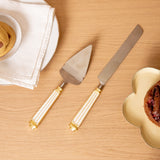 Classic dessert serving duo is elegantly crafted in stainless steel and Aluminium with white enamel detailing. Cake knife and server share strategically contoured heads and flowing handles with squared-off tips.
