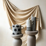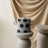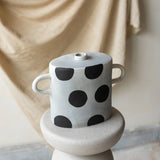 Playful yet bold, the Polka Vase features a cylindrical body adorned with striking black polka dots on a soft marbled white background. The symmetrical twin handles add a whimsical charm, while the flat top design makes it a modern conversation piece. Ideal for minimalist spaces with a pop-art edge, this vase stands out whether styled with blooms or displayed solo.